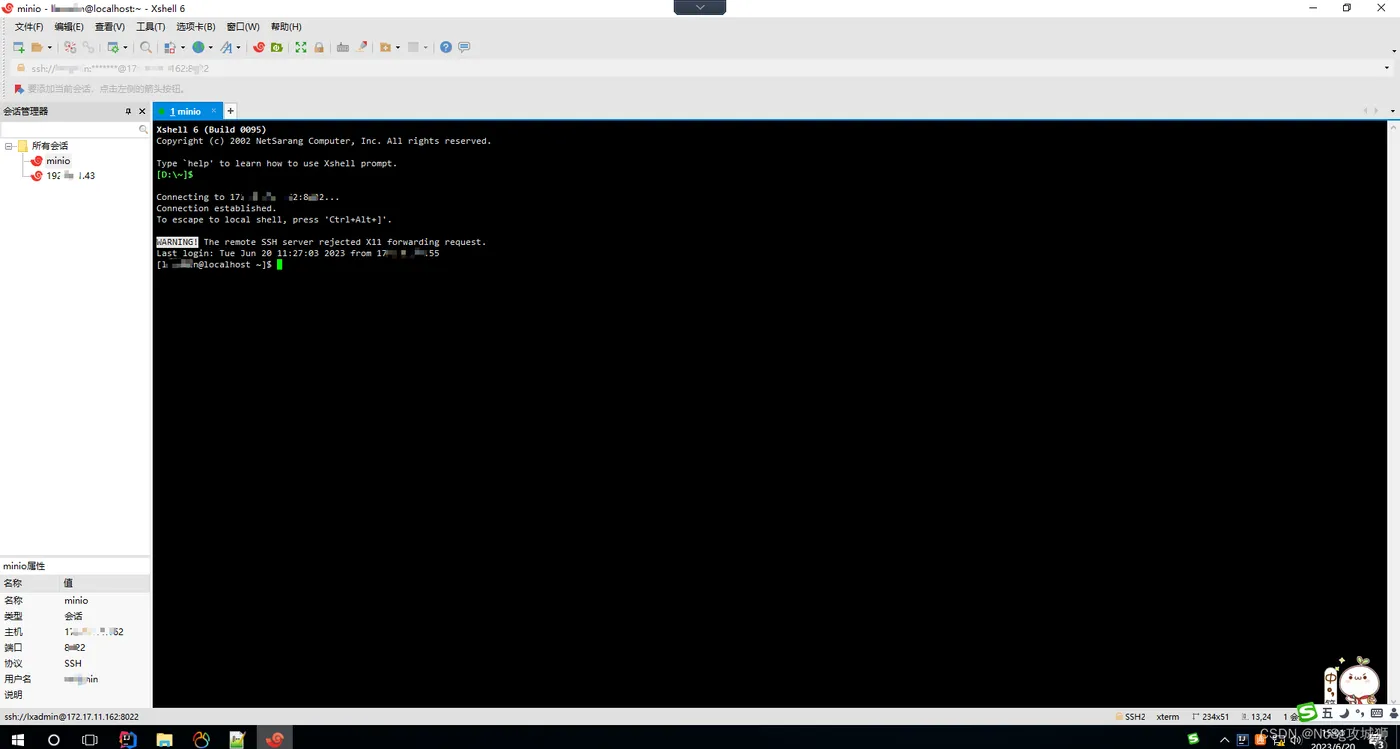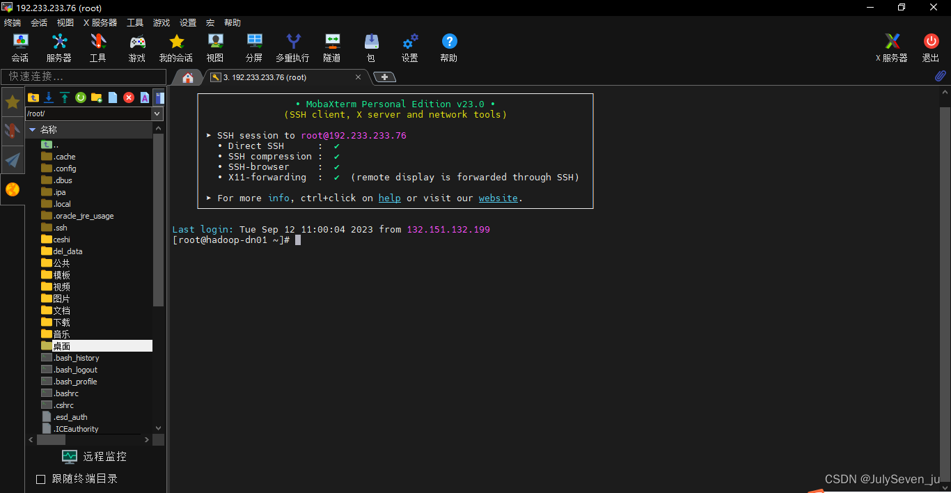 点击左上角的会话 - ssh - 输入远程主机 - 指定用户名 - 确定 - 输入密码